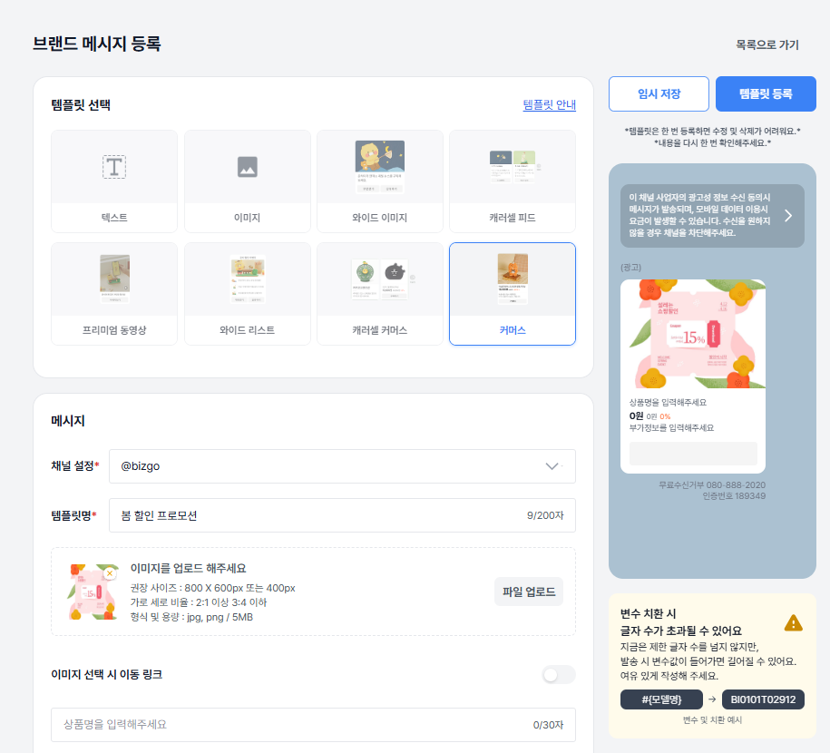 - 템플릿 등록 : 콘솔 > [템플릿 관리 > 브랜드 메시지]에서 타입 선택 후 등록합니다.