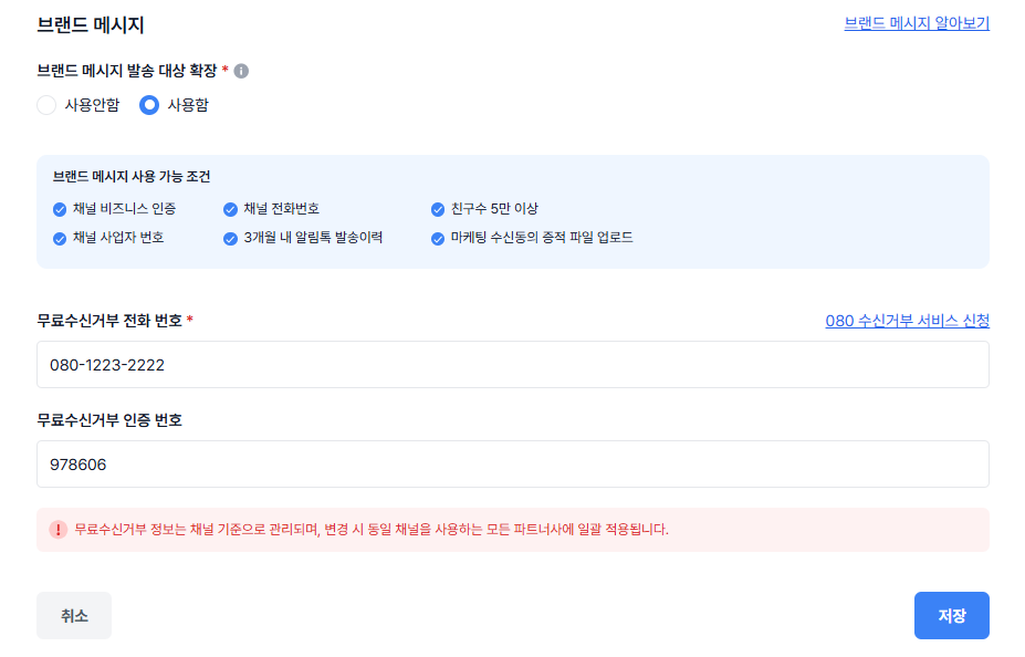 - 080 수신 거부 연계: 브랜드메시지 발송 시 필요한 080 무료 수신 거부 번호를 등록 및 수정 진행 가능합니다.